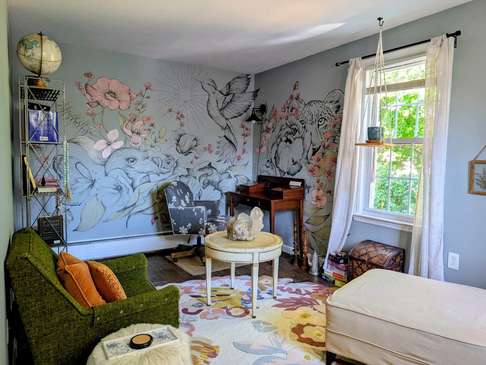 In this space you'll find all key essentials to nourish your mind, body and soul. Fresh towels, cozy blankets, a space to stretch, move, or ponder. A kitchen equipped to romanticize serving yourself. There are books to peruse, pages to color, puzzles to piece together and more. Please care for this space as though it is your own!